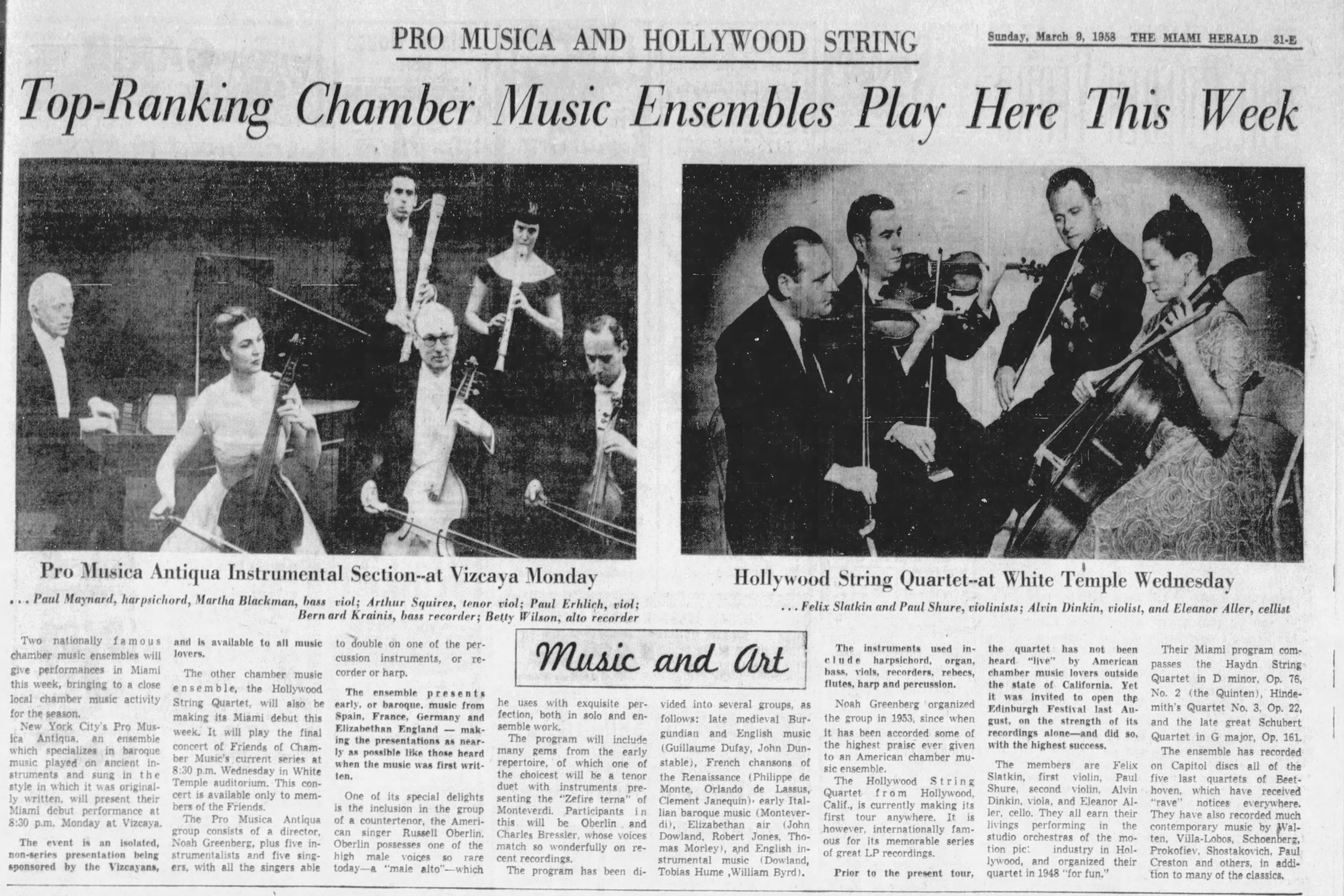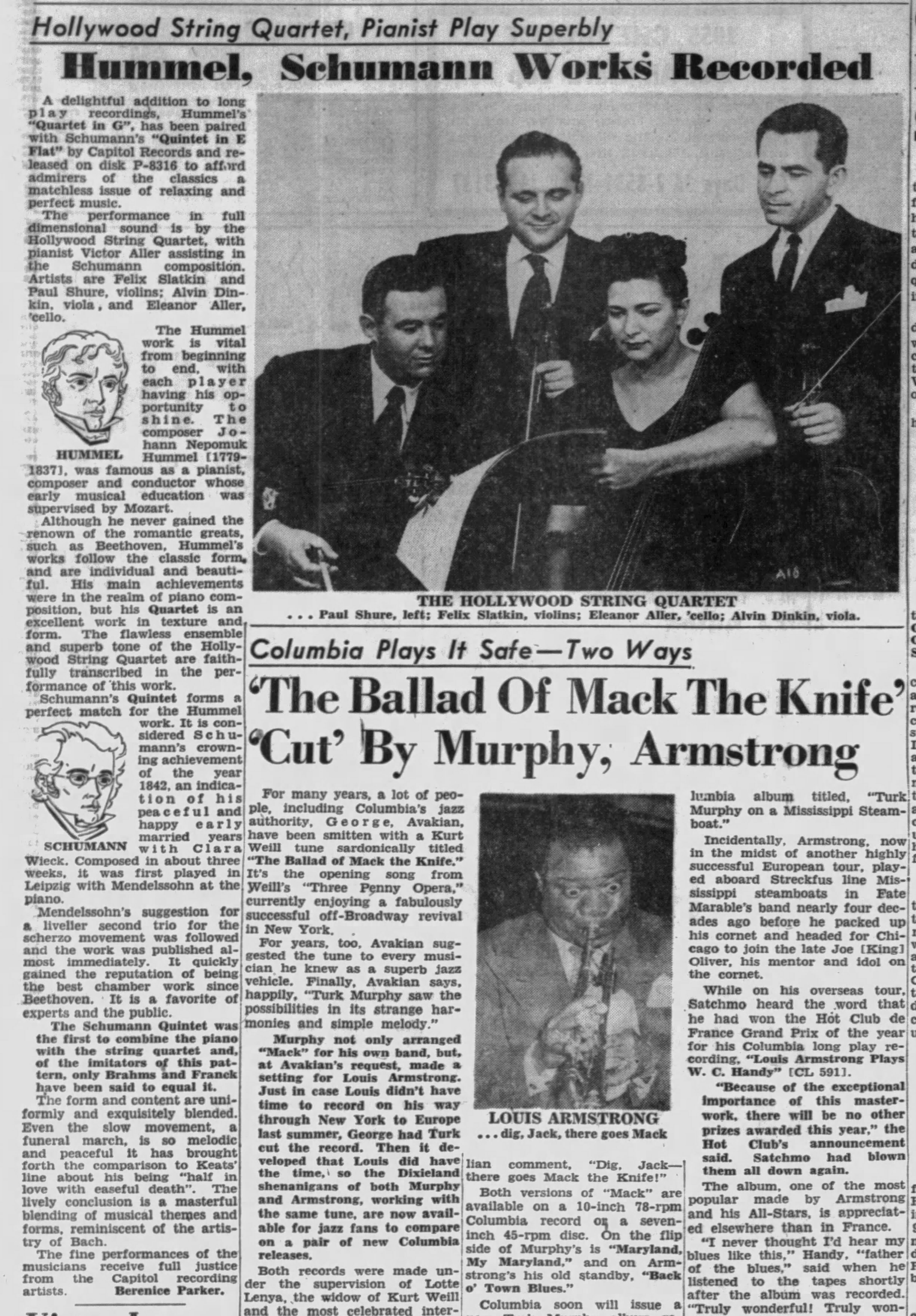 Far from 'a stuffy ensemble dedicated solely to "longhair" music, the four were busy session musicians who contributed to everv aspect of the Hollywood music scene. "We were affiliated with Capitol and had an agreement to do all the commercial records to make money, because we certainly didn't make money from the Quartet!" Eleanor maintains. "Early rock-and-roll, jazz, and pop albums; TV and film scores . . . we did it all," says Shure.