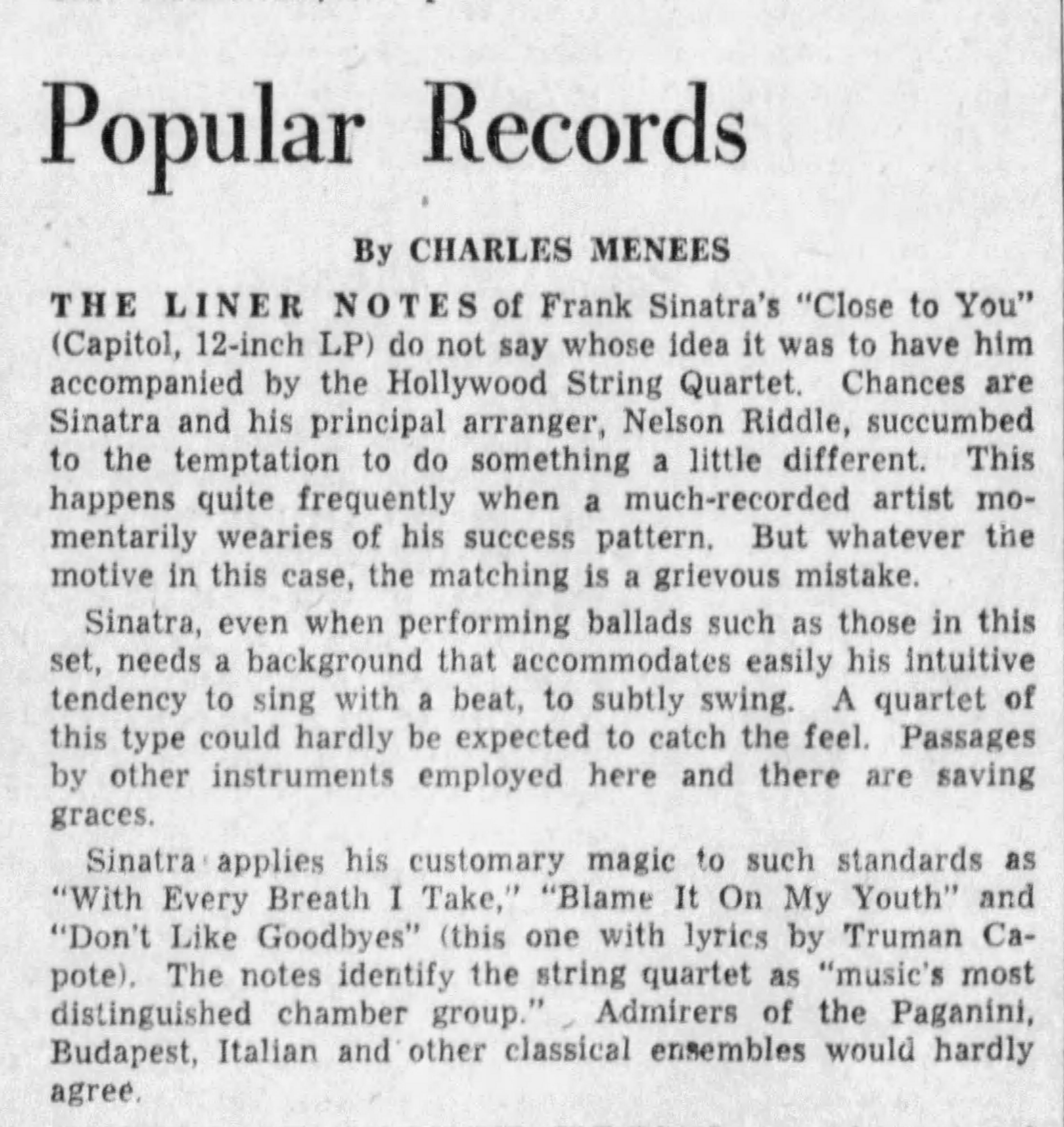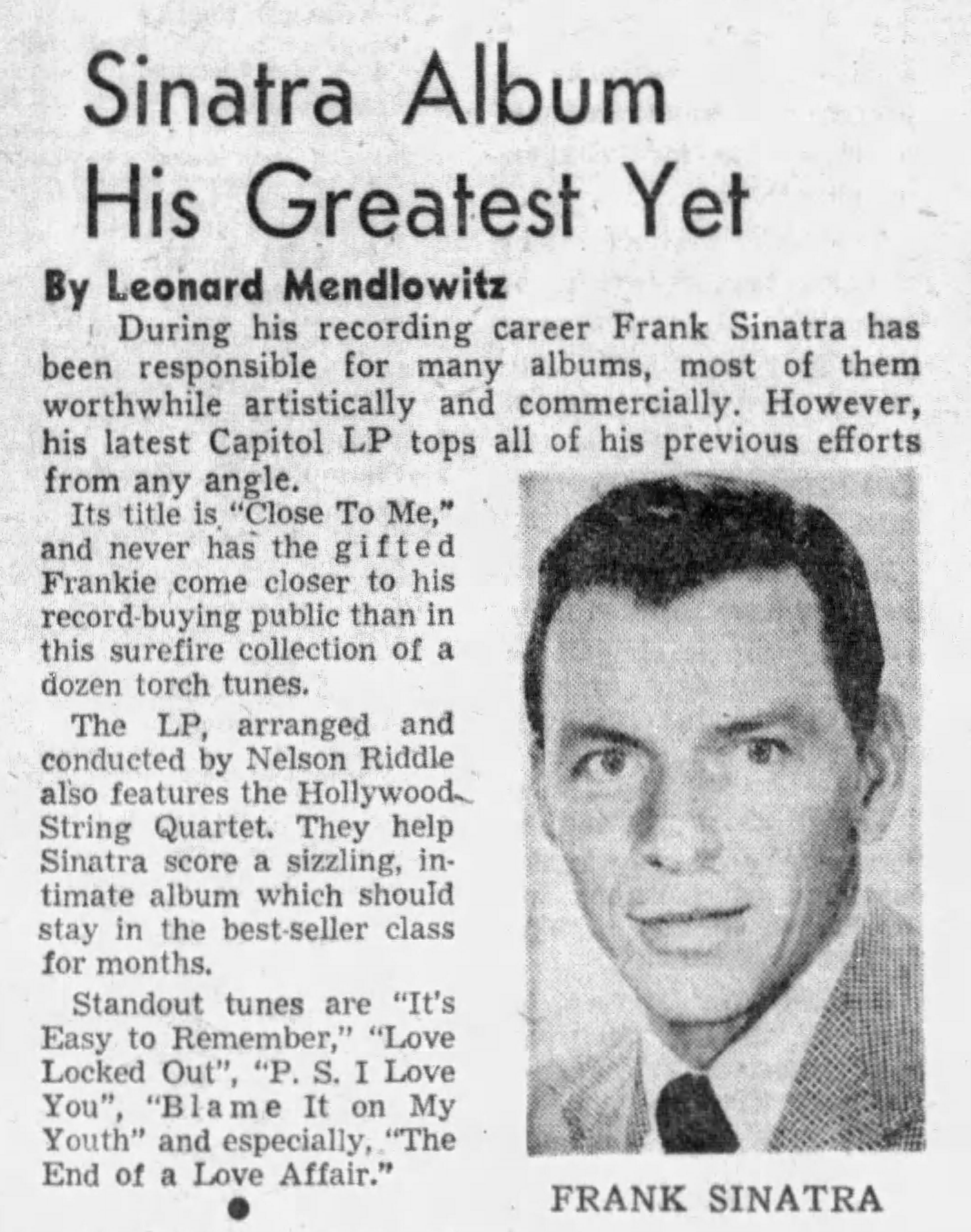 (click here for details of the HSQ’s involvement in the classic Frank Sinatra album "CLOSE TO YOU")