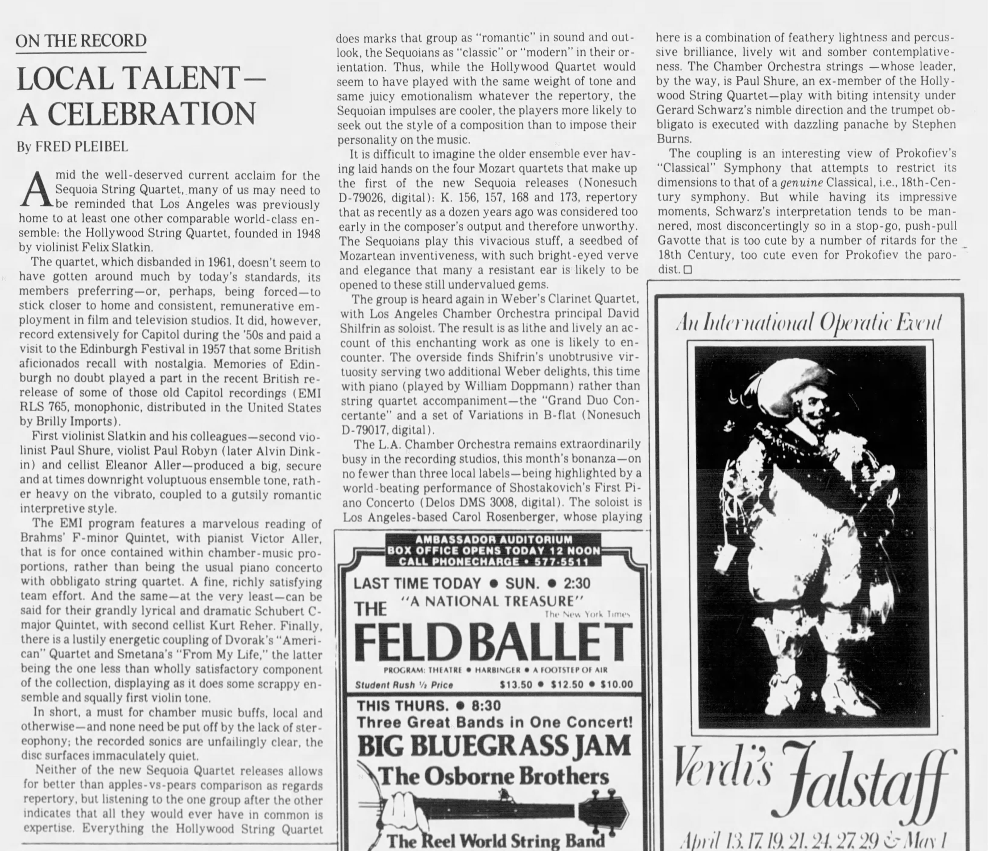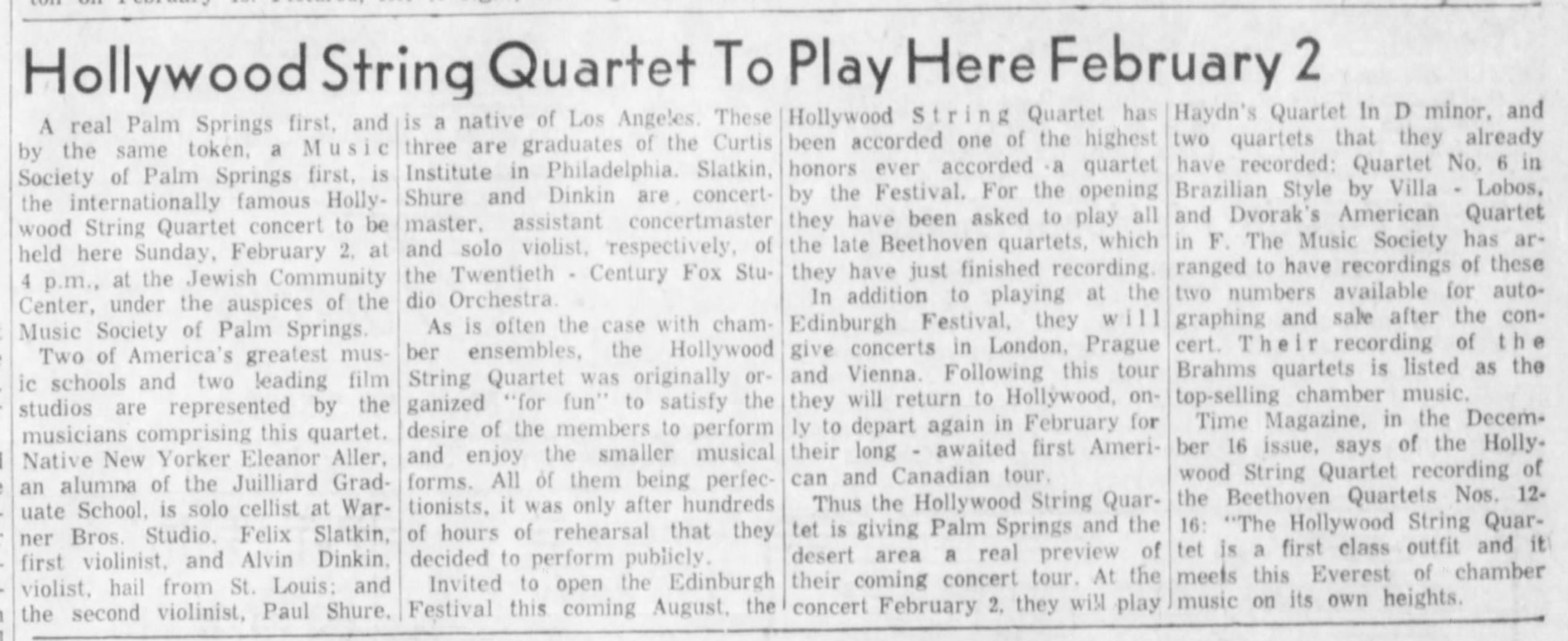"Outside of the fact that each person in his own right was an extremely capable instrumentalist was the flexibility that we had. We could play all different styles of music, without having to reach for it. Eleanor was a damned good commercial player-she had a real sense for the style of commercial music," Shure says. "Curiously, even though we were extremely active in the Hollywood scene, the name `Hollywood String Quartet' had nothing to do with `Hollywood' music. We all happened to be from Hollywood, and no one ever had a quartet from there that made anything of themselves. So, we said, `Why not?' Instead of `The Los Angeles String Quartet,' we'll call ourselves `The Hollywood String Quartet."'